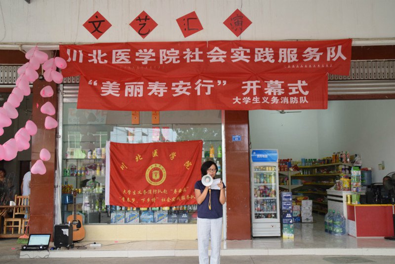 2015年7月16日晚,为了践行“八字真经”,投身“四个全面”,川北医学院义务消防队赴蒲江县寿安镇社会实践服务团于寿安镇一超市处举行“三下乡”开幕仪式暨文艺汇演。整个演出观看居民及演出队员共达六十余人,演出时长约一个半小时。